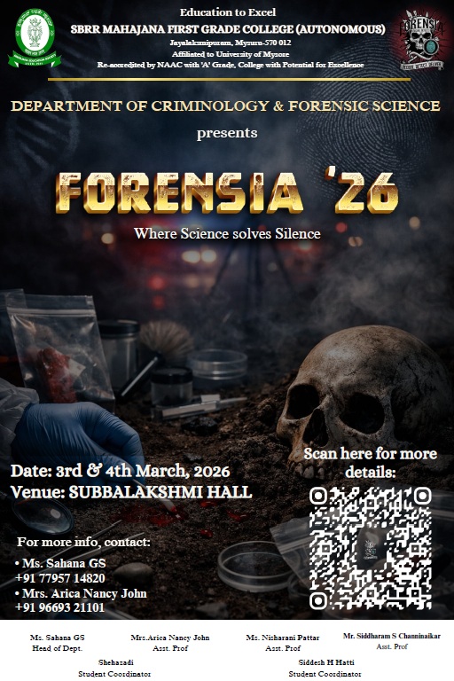 Forensia 26 – Dept of Criminology and Forensic Science Posted by fgcmahajana Date February 24, 2026 Forensia 26 – Dept of Criminology and Forensic Science by 34 34 people viewed this event. Register for event To register for this event please visit the following URL: → Date And Time 2026-03-03 @ 10:00 AM to 2026-03-04 @ 04:00 PM Location - Event Types Other Event Category Mahajana FGC Share With Friends Facebook Twitter Linkedin Xing Pinterest Share: fgcmahajana Previous post One-Day State Level Conference - Dept of Commerce & BBA with IQAC - 26/02/2026 February 24, 2026 Next post One Day Workshop - E-Filling of ITRs by Dept of Economics & IQAC - 04/03/2026 March 2, 2026 You may also like Sports Achievements in Football & Rizzball – 24 02 2026 24 February, 2026 Our students of B.Sc. CPBC and BTBM participated in the National conference. Won best poster awards today at MMK SDM College, Mysuru. 14/02/2026 16 February, 2026 MahaTarang Inter College PU Fest – 30/10/2025 5 November, 2025