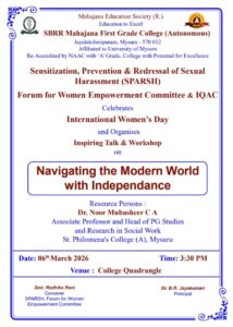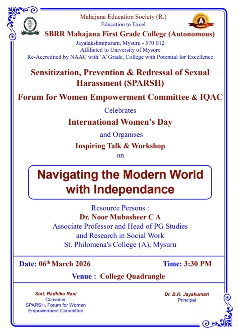 Inspiring Talk & Workshop on Navigating the modern World with independence – 06/03/2026 Posted by fgcmahajana Date March 2, 2026 Inspiring Talk & Workshop on Navigating the modern World with independence – 06/03/2026 by 16 16 people viewed this event. Register for event To register for this event please visit the following URL: → Date And Time - to 2026-03-06 @ 04:30 PM Location - Event Types Other Event Category Mahajana FGC Share With Friends Facebook Twitter Linkedin Xing Pinterest Share: fgcmahajana Previous post One Day Workshop - E-Filling of ITRs by Dept of Economics & IQAC - 04/03/2026 March 2, 2026 Next post Sportiva 2k26 Teacher’s Annual Sports meet – 07/03/2025 March 2, 2026 You may also like Sports Achievements in Football & Rizzball – 24 02 2026 24 February, 2026 Our students of B.Sc. CPBC and BTBM participated in the National conference. Won best poster awards today at MMK SDM College, Mysuru. 14/02/2026 16 February, 2026 MahaTarang Inter College PU Fest – 30/10/2025 5 November, 2025