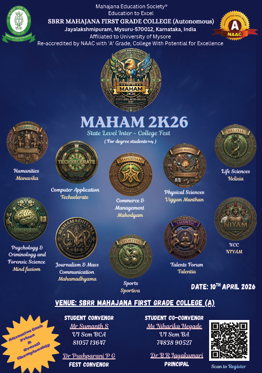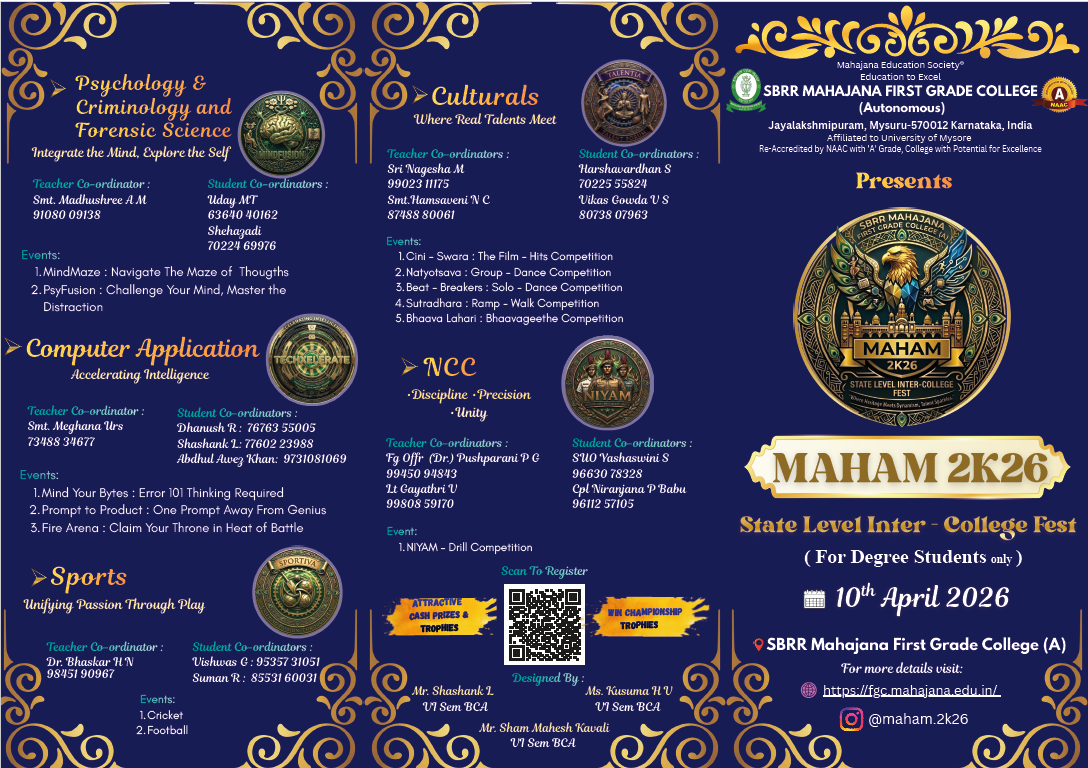 MAHAM 2K26 – 10-04-2026 Posted by fgcmahajana Date March 28, 2026 MAHAM 2K26 – 10-04-2026 by 306 306 people viewed this event. Register for event To register for this event please visit the following URL: → Date And Time 2026-04-10 @ 10:00 AM to 2026-04-10 @ 07:00 PM Location - Event Types Festival or Fair Event Category Mahajana FGC Share With Friends Facebook Twitter Linkedin Xing Pinterest Share: fgcmahajana Previous post Graduation Day Ceremony - 28/03/2026 March 28, 2026 You may also like Sports Achievements in Football & Rizzball – 24 02 2026 24 February, 2026 Our students of B.Sc. CPBC and BTBM participated in the National conference. Won best poster awards today at MMK SDM College, Mysuru. 14/02/2026 16 February, 2026 MahaTarang Inter College PU Fest – 30/10/2025 5 November, 2025