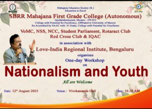 One day Workshop: Nationalism & Youth -12-08-2025 Posted by fgcmahajana Date August 11, 2025 One day Workshop: Nationalism & Youth -12-08-2025 by 594 594 people viewed this event. Register for event To register for this event email your details to info.fgc@mahajana.edu.in Register using webmail: Gmail / AOL / Yahoo / Outlook Date And Time 2025-08-12 @ 10:30 AM to 2025-08-12 @ 01:00 PM Location - Event Category Mahajana FGC Share With Friends Facebook Twitter Linkedin Xing Pinterest Share: fgcmahajana Previous post Graduation Ceremony 2025 August 11, 2025 Next post Special Talks: Indian Traditional Education System by Dept of Sanskrit & IQAC – 13 08 2025 August 12, 2025 You may also like Sports Achievements in Football & Rizzball – 24 02 2026 24 February, 2026 Our students of B.Sc. CPBC and BTBM participated in the National conference. Won best poster awards today at MMK SDM College, Mysuru. 14/02/2026 16 February, 2026 MahaTarang Inter College PU Fest – 30/10/2025 5 November, 2025