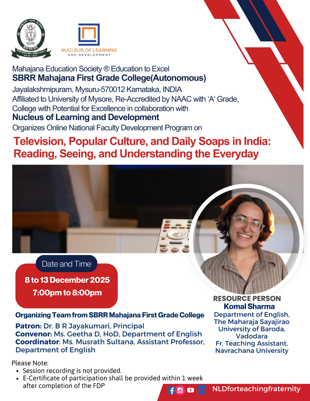Online National Faculty Development Program – 8 to 13 Dec 2025 Posted by fgcmahajana Date December 7, 2025 Online National Faculty Development Program – 8 to 13 Dec 2025 by 216 216 people viewed this event. Register for event To register for this event email your details to info.fgc@mahajana.edu.in Register using webmail: Gmail / AOL / Yahoo / Outlook Date And Time 2025-12-08 @ 07:00 PM to 2025-12-13 @ 08:00 PM Location Online event Event Types Class, Training, or Workshop Event Category Mahajana FGC Share With Friends Facebook Twitter Linkedin Xing Pinterest Share: fgcmahajana Previous post On the occasion of Kannada Rajyotsava, Celebration of Kannada Habba - 15/11/2025 December 7, 2025 Next post Four-day Training Program on Artificial Intelligence - 9,10,11 & 12th December 2025 December 9, 2025 You may also like Sports Achievements in Football & Rizzball – 24 02 2026 24 February, 2026 Our students of B.Sc. CPBC and BTBM participated in the National conference. Won best poster awards today at MMK SDM College, Mysuru. 14/02/2026 16 February, 2026 MahaTarang Inter College PU Fest – 30/10/2025 5 November, 2025