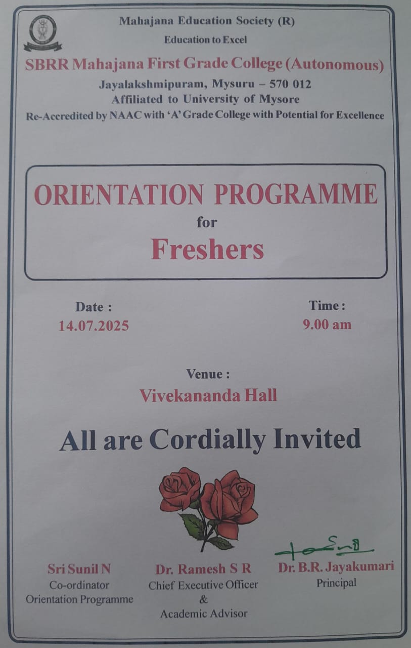 Orientation Programme for Freshers – 2025 Posted by fgcmahajana Date July 14, 2025 Orientation Programme for Freshers – 2025 by 635 635 people viewed this event. Register for event To register for this event email your details to info.fgc@mahajana.edu.in Register using webmail: Gmail / AOL / Yahoo / Outlook Date And Time 2025-07-14 @ 10:00 AM to 2025-07-14 @ 04:30 PM Location - Event Category Mahajana FGC Share With Friends Facebook Twitter Linkedin Xing Pinterest Share: fgcmahajana Previous post Valedictory of Student Parliament & Talent Forum & Farewell to Final Year Students July 14, 2025 Next post Graduation Ceremony 2025 July 21, 2025 You may also like Sports Achievements in Football & Rizzball – 24 02 2026 24 February, 2026 Our students of B.Sc. CPBC and BTBM participated in the National conference. Won best poster awards today at MMK SDM College, Mysuru. 14/02/2026 16 February, 2026 MahaTarang Inter College PU Fest – 30/10/2025 5 November, 2025