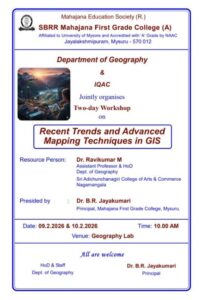 Recent Trends & Advanced Mapping Techniques in GIS by Dept of Geography & IQAC Posted by fgcmahajana Date February 8, 2026 Recent Trends & Advanced Mapping Techniques in GIS by Dept of Geography & IQAC by 82 82 people viewed this event. Register for event To register for this event please visit the following URL: → Date And Time 2026-02-09 @ 10:00 AM to 2026-02-10 @ 04:00 PM Location - Event Types Class, Training, or Workshop Event Category Mahajana FGC Share With Friends Facebook Twitter Linkedin Xing Pinterest Share: fgcmahajana Previous post RUSA 2.0 Two-day Student Development Programme for all Final Year Students. February 8, 2026 Next post One-Day State Level Conference - Dept of Commerce & BBA with IQAC - 26/02/2026 February 23, 2026 You may also like Sports Achievements in Football & Rizzball – 24 02 2026 24 February, 2026 Our students of B.Sc. CPBC and BTBM participated in the National conference. Won best poster awards today at MMK SDM College, Mysuru. 14/02/2026 16 February, 2026 MahaTarang Inter College PU Fest – 30/10/2025 5 November, 2025