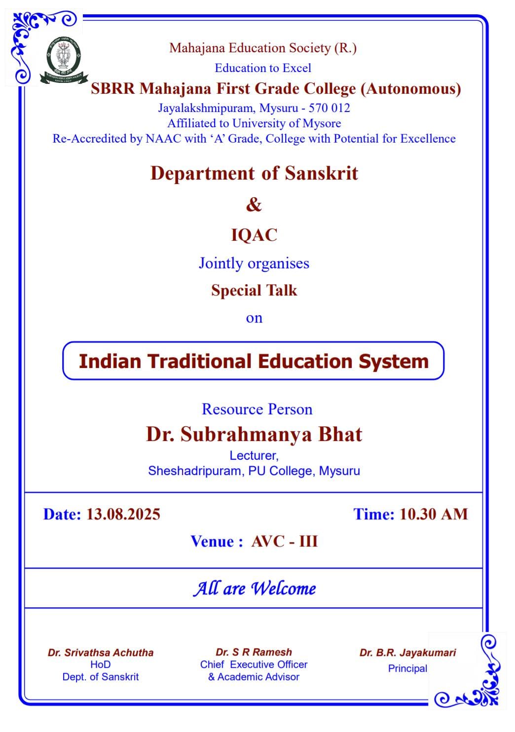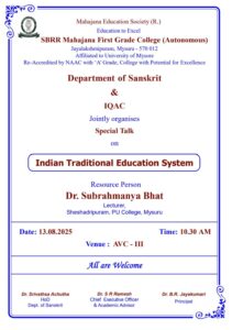 Special Talks: Indian Traditional Education System by Dept of Sanskrit & IQAC – 13 08 2025 Posted by fgcmahajana Date August 12, 2025 Special Talks: Indian Traditional Education System by Dept of Sanskrit & IQAC – 13 08 2025 by 640 640 people viewed this event. Register for event To register for this event email your details to info.fgc@mahajana.edu.in Register using webmail: Gmail / AOL / Yahoo / Outlook Date And Time 2025-08-13 @ 10:00 AM to 2025-08-13 @ 12:30 AM Location - Event Types Seminar or Talk Event Category Mahajana FGC Share With Friends Facebook Twitter Linkedin Xing Pinterest Share: fgcmahajana Previous post One day Workshop: Nationalism & Youth -12-08-2025 August 12, 2025 Next post Orientation 2025-26 & Geneva Convention Day by Youth Red Cross & IQAC - 13 08 2025 August 12, 2025 You may also like Sports Achievements in Football & Rizzball – 24 02 2026 24 February, 2026 Our students of B.Sc. CPBC and BTBM participated in the National conference. Won best poster awards today at MMK SDM College, Mysuru. 14/02/2026 16 February, 2026 MahaTarang Inter College PU Fest – 30/10/2025 5 November, 2025